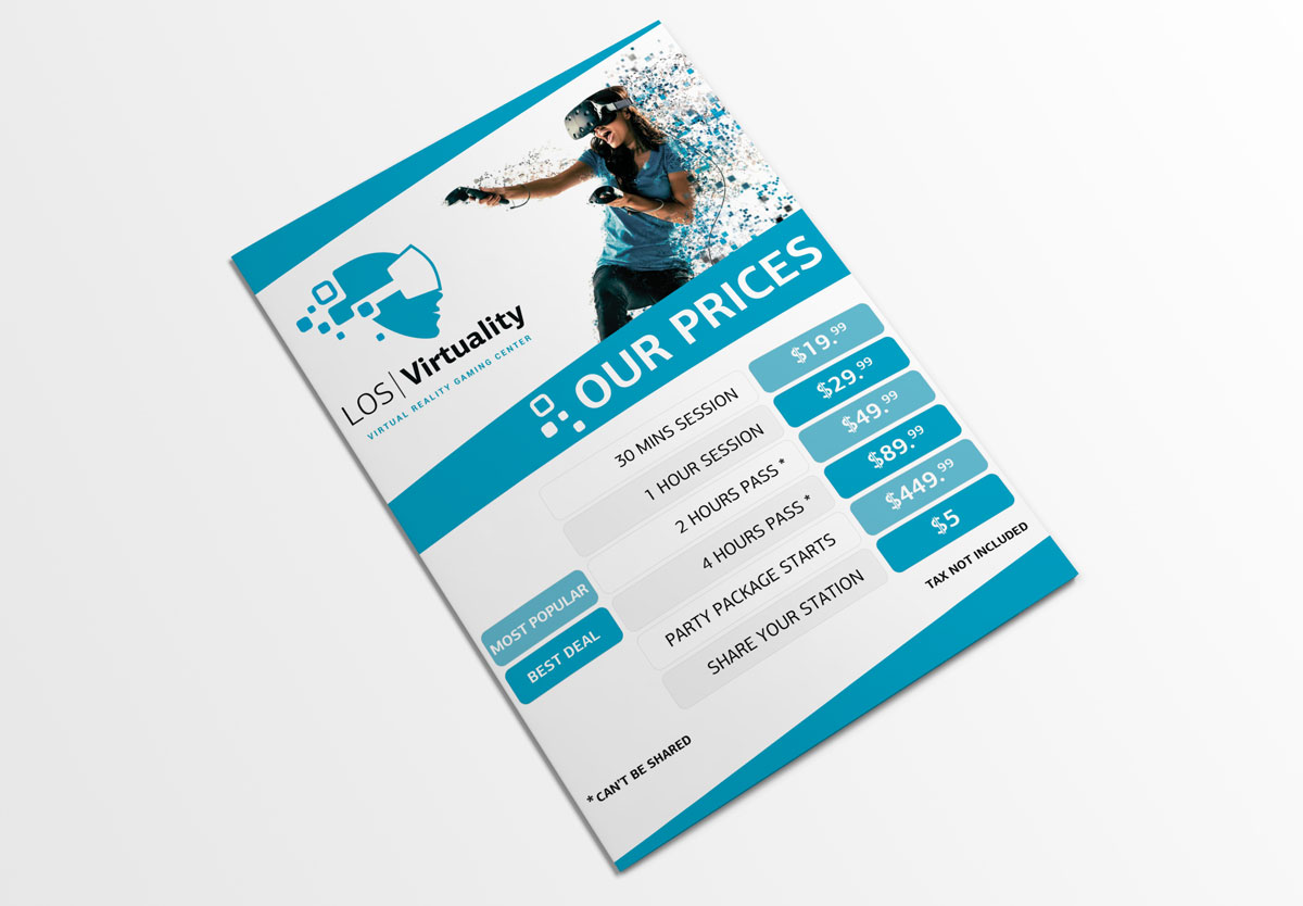 Логотип, визитка, флаер,прайс и афиша для VR центра Главная страница » Портфолио » Логотип, визитка, флаер, прайс и афиша для VR центра проекты Los Virtuality Срок 10 дней Год реализации 2019 Категория Графический дизайн